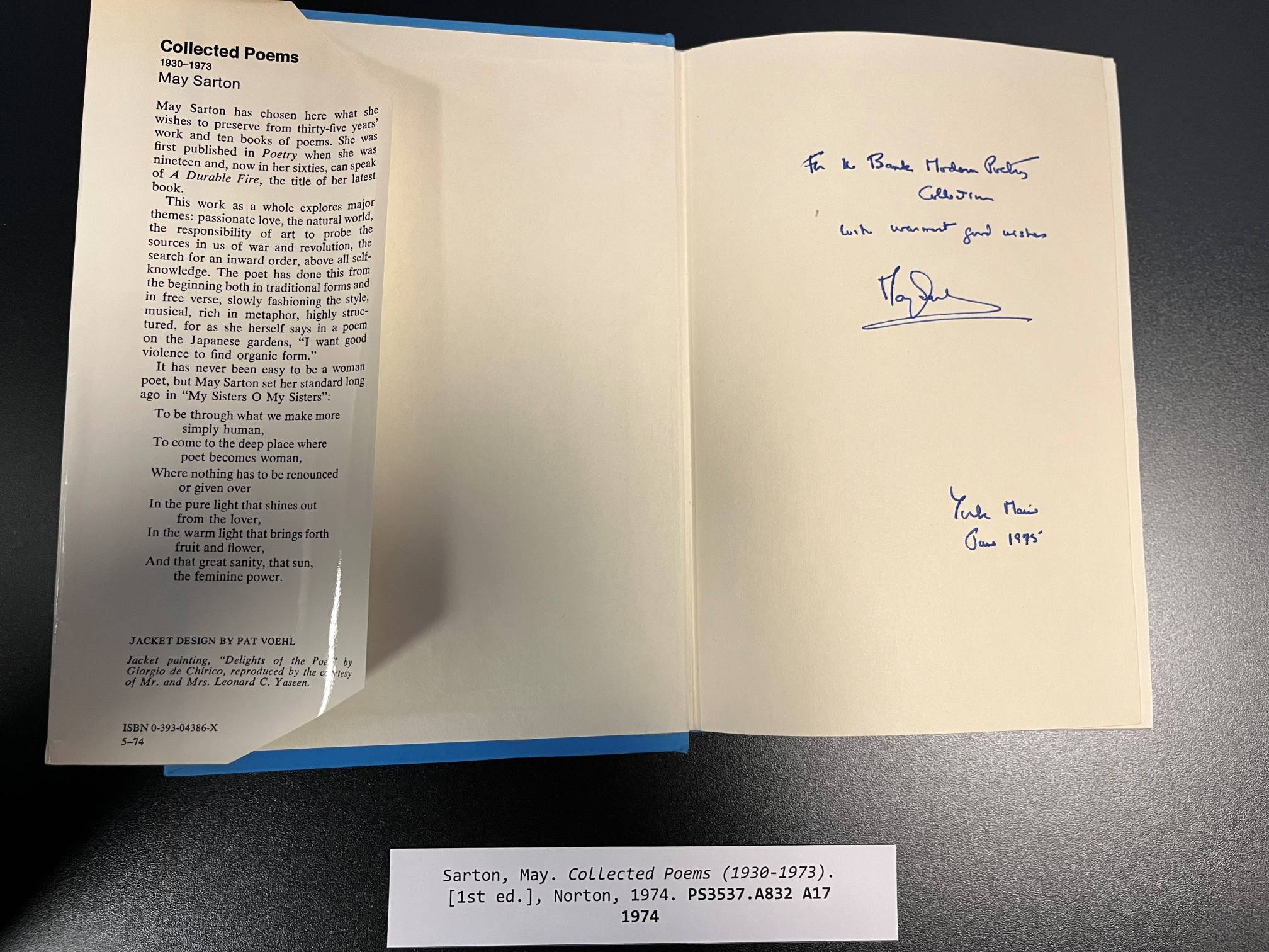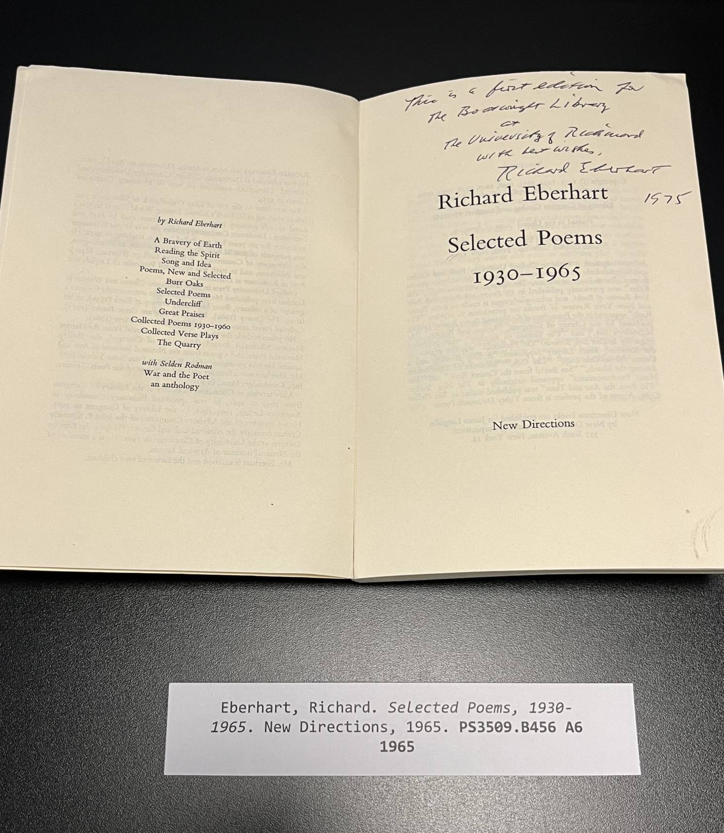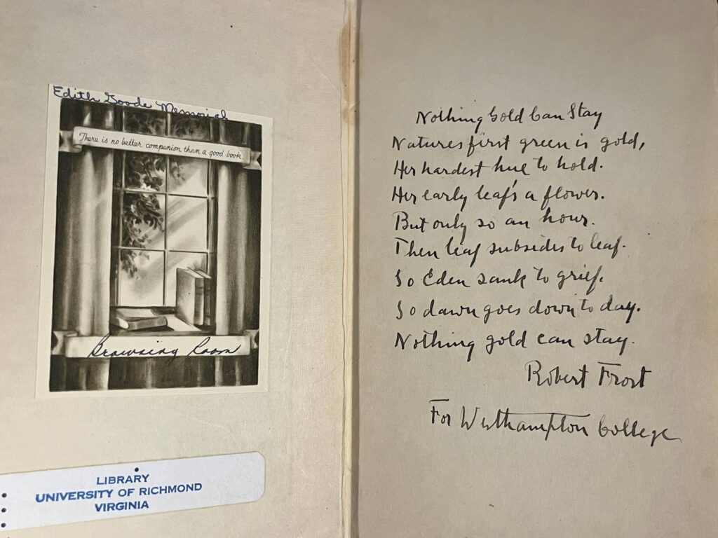 In a smaller collection, this would have been the end of it, but there were a few twists along the way. Many of the news articles referenced two signed volumes of Robert Frost’s: West-Running Brook and Selected Poems. Among the over 15,000 volumes are two copies of Frost’s West-Running Brook, and they are both signed. Luckily a Collegian article mentioned it was inscribed to Westhampton College, thereby eliminating the volume that just said ‘Richmond 1929.’