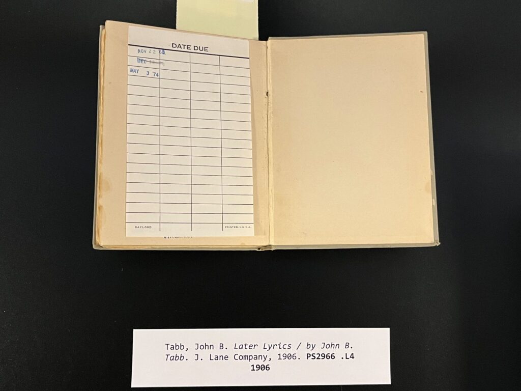 Now that the ground floor has opened, I was able to use my research to mount an exhibit of the books involved in both stages of Bank’s library involvement, and when University Communications reached out about reviving an article about the booknapping, I had the books handy and was able to facilitate their moment in the spotlight. The exact volumes he held hostage, along with certain volumes he collected as part of the “Bank Modern Poetry Collection,” will be on display outside the Galvin Rare Book Reading Room until the end of the semester.